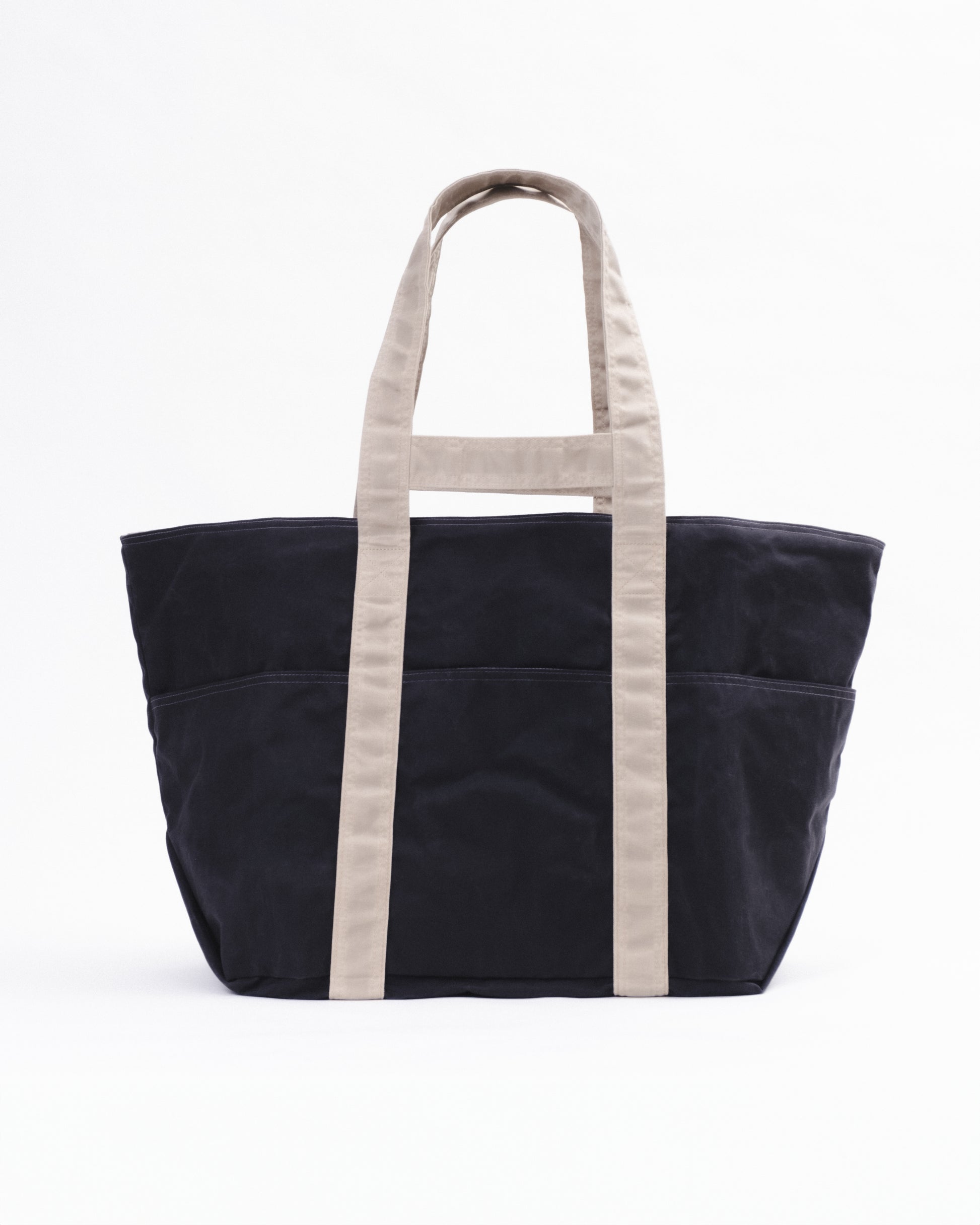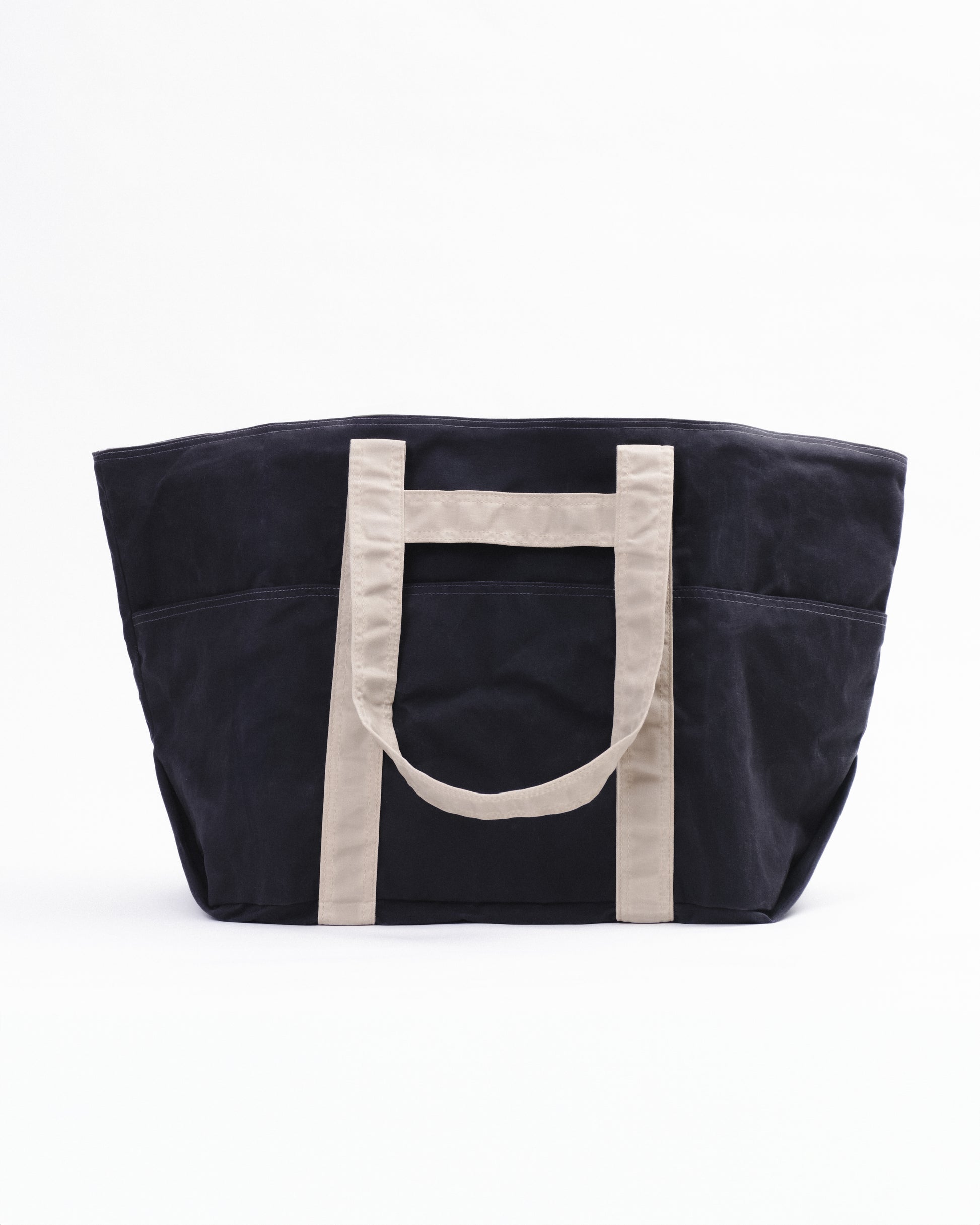 This two-toned waxed canvas tote captures the essence of minimalist design with a fresh twist. The contrasting ASPHALT strap highlights its clean lines, making it a stylish yet practical choice for those who appreciate a modern, understated aesthetic.