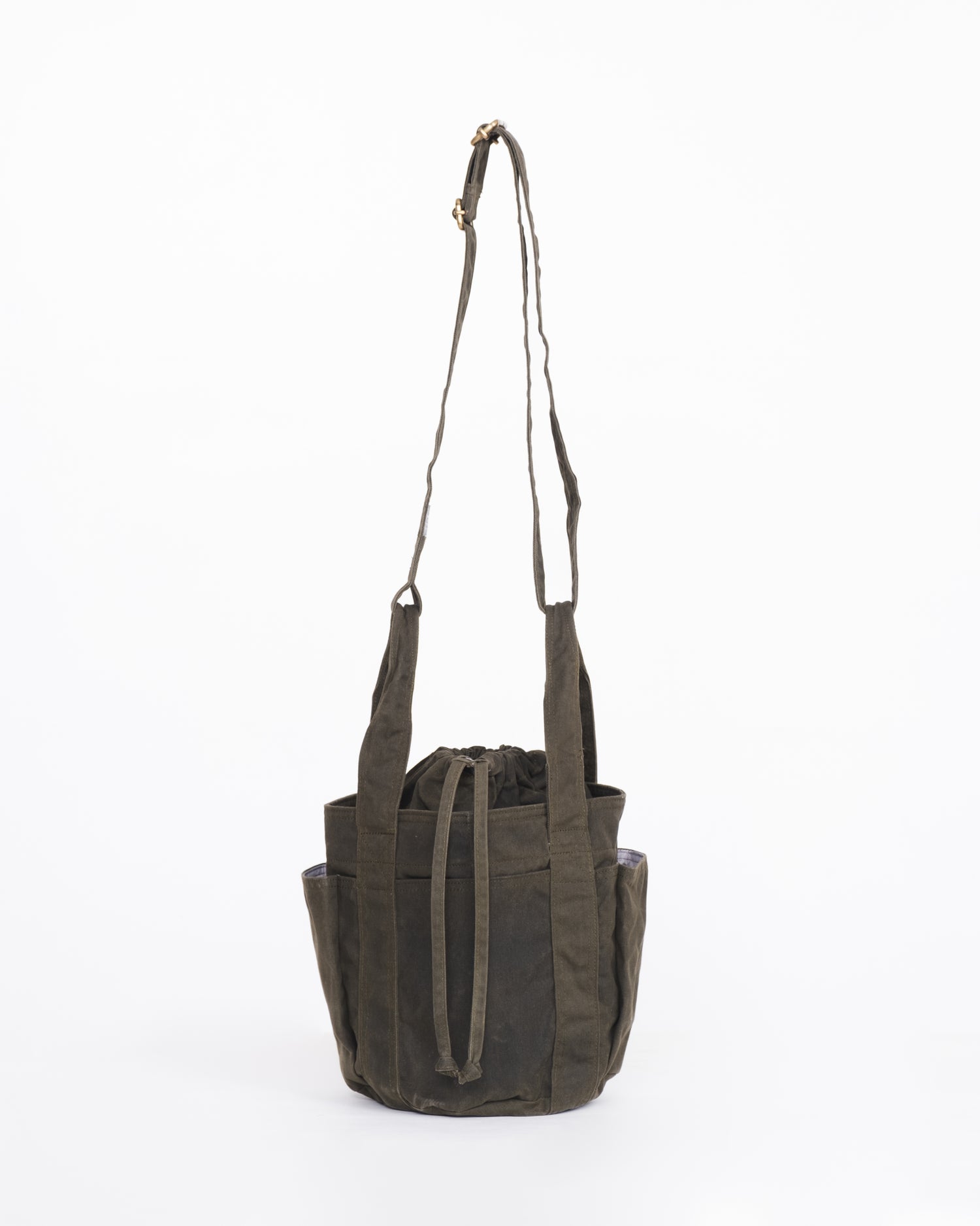 Featuring four exterior pockets, a spacious main compartment, and a drawstring closure, it keeps smaller items secure while remaining easy to access. Its structured form allows the bag to stand on its own, while a top handle and adjustable shoulder strap provide flexible carry throughout the day.