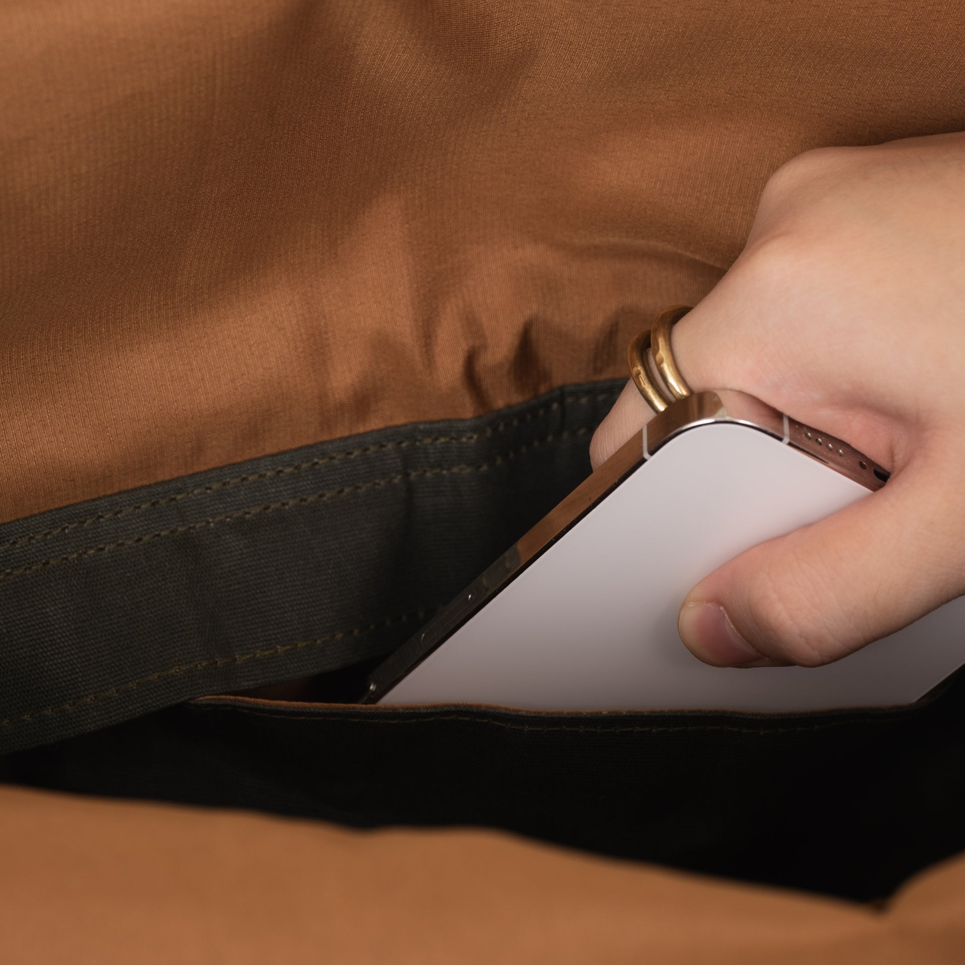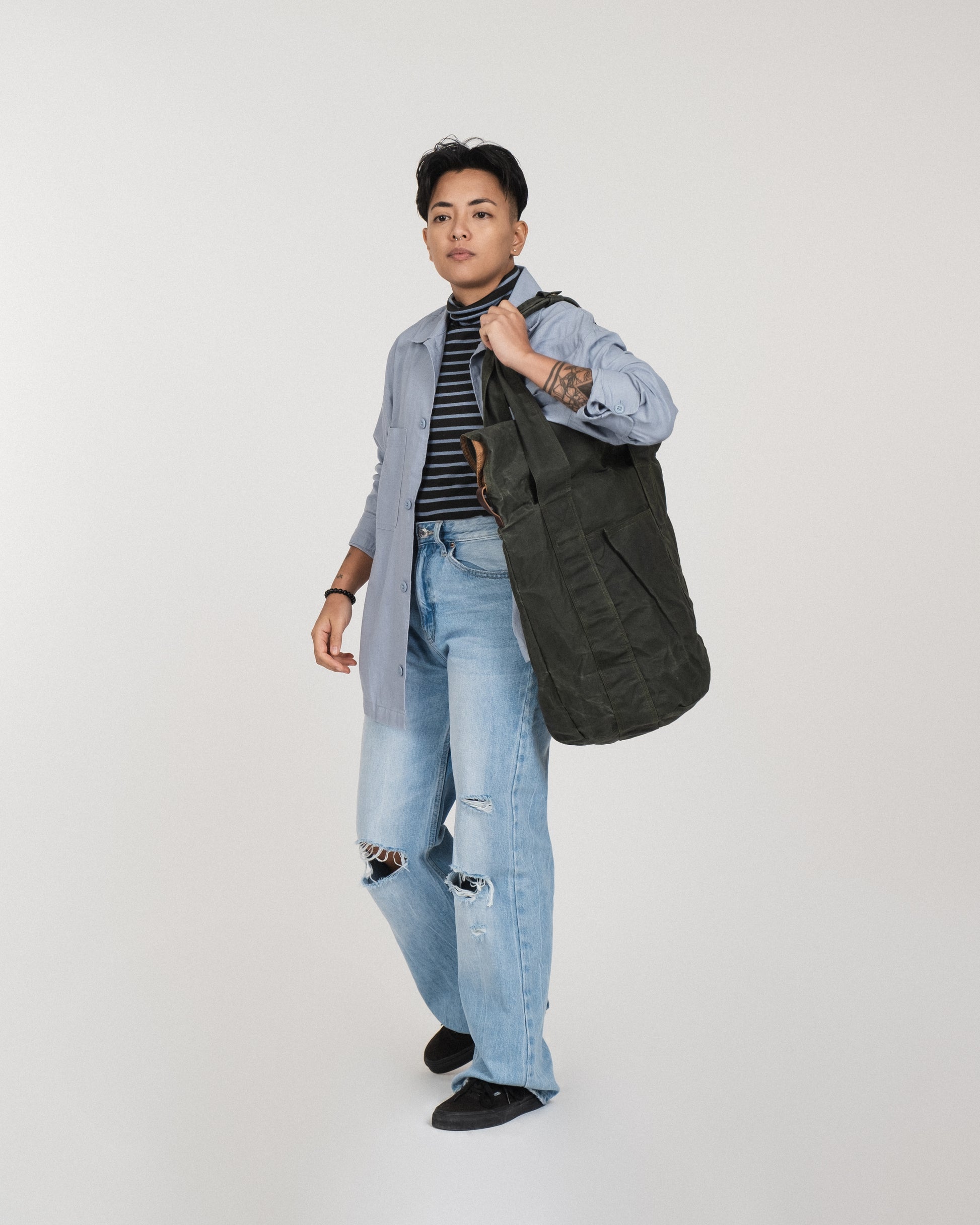 It is made of waxed canvas and, like fine wine, improves over time. With its marks and creases eventually creating a rich patina, it makes for a unique personal piece as it ages.